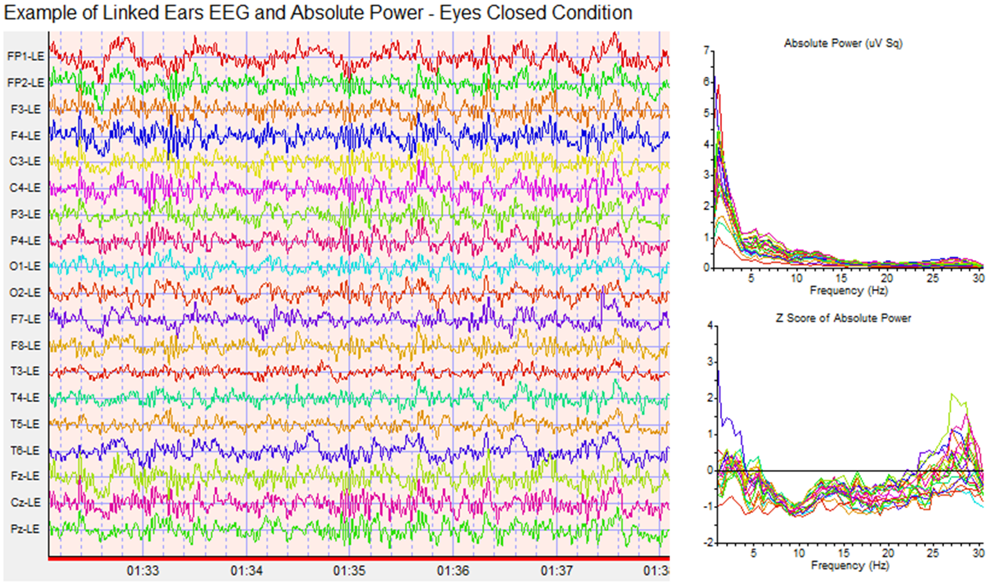A trained and experienced clinician would examine the EEG record and QEEG results to determine what brain wave abnormalities might be associated with the client’s symptoms. In this case there are two markers for anxiety and obsessive-compulsiveness: (1) beta spindles, and (2) attenuated alpha.